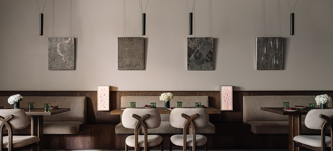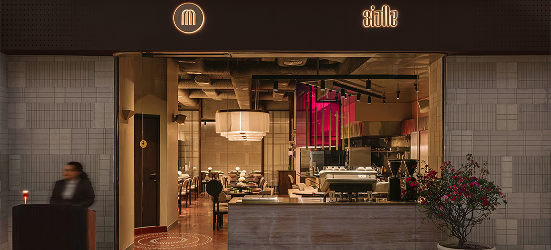 Anjeer, is an unexpected, modish twist on Indian dining, inviting guests to experience the fine art of cooking at the kitchen counter! This fusion of cooking and dining functions posed distinct lighting challenges. To achieve coherence amidst these contrasts, we chose 3000K lighting throughout but retained cool 4000K in the kitchen exhaust hoods. Supporting the brand story, key action zones were accentuated. Spotlights over the coffee counter turn the barista’s work into a theatrical display. A pink-lit glass cube, floats over the chef’s table and slender pendants emphasize the bar’s curvature, all leading the guest through a visually rich narrative.